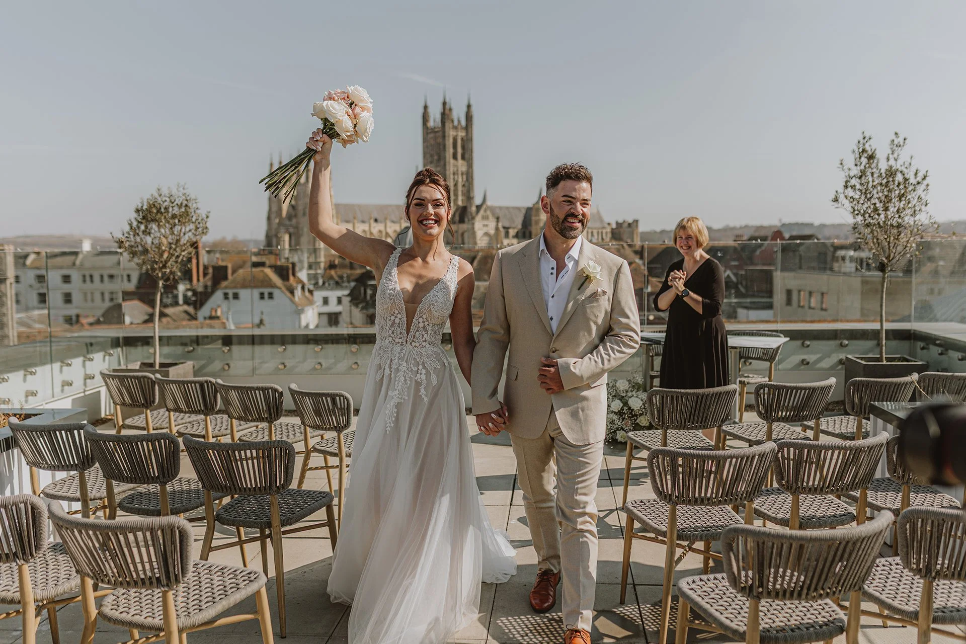 The perfect wedding venue in the heart of Canterbury, with private entrance and lift, spectacular views across the city and cathedral, outside heated rooftop terrace, dance floor area, bar and kitchen.